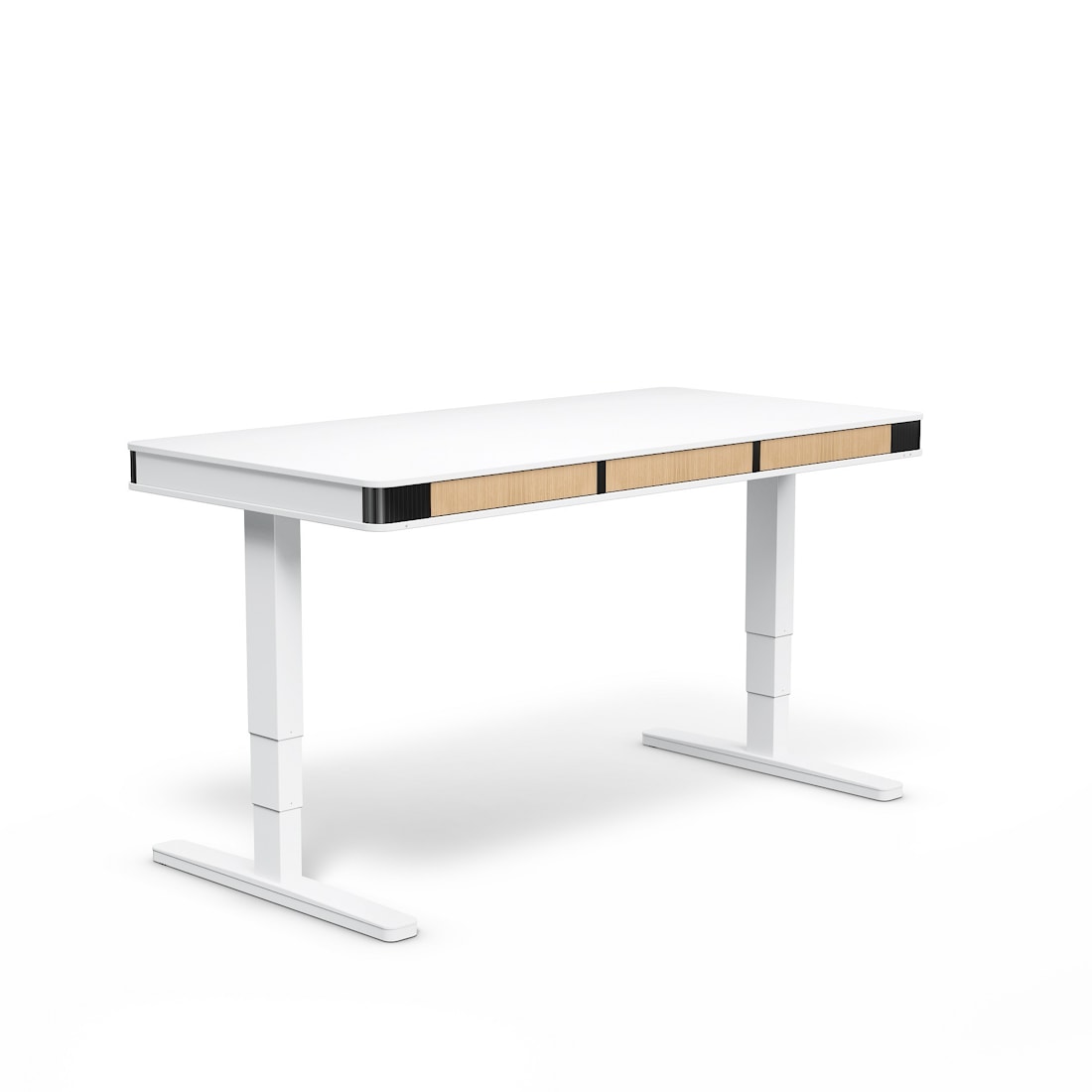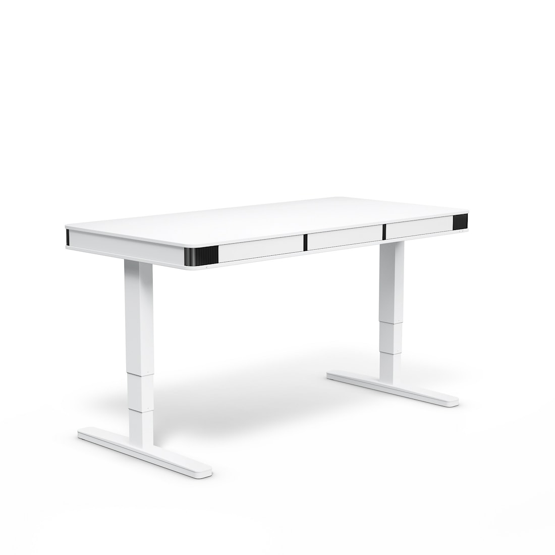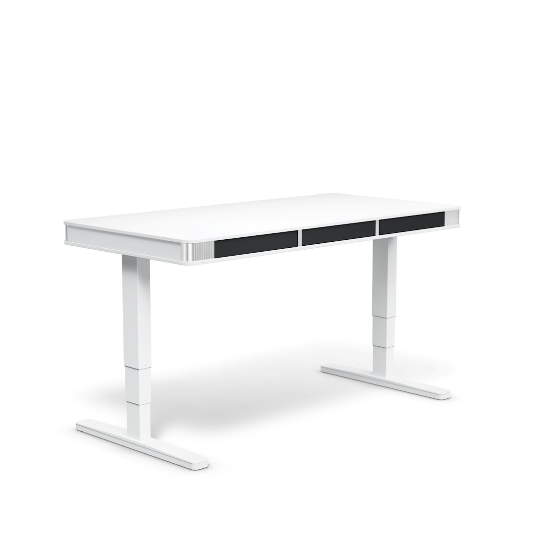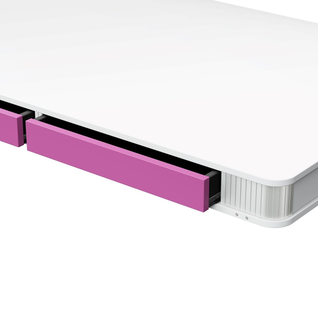 Дизайнерский регулируемый стол moll T6 L доступен в 2-х цветах корпуса, 5-ти цветах декора ящиков и 3-х отделок алюминиевого профиля: