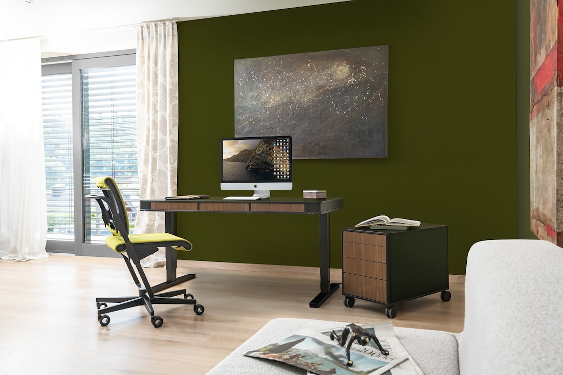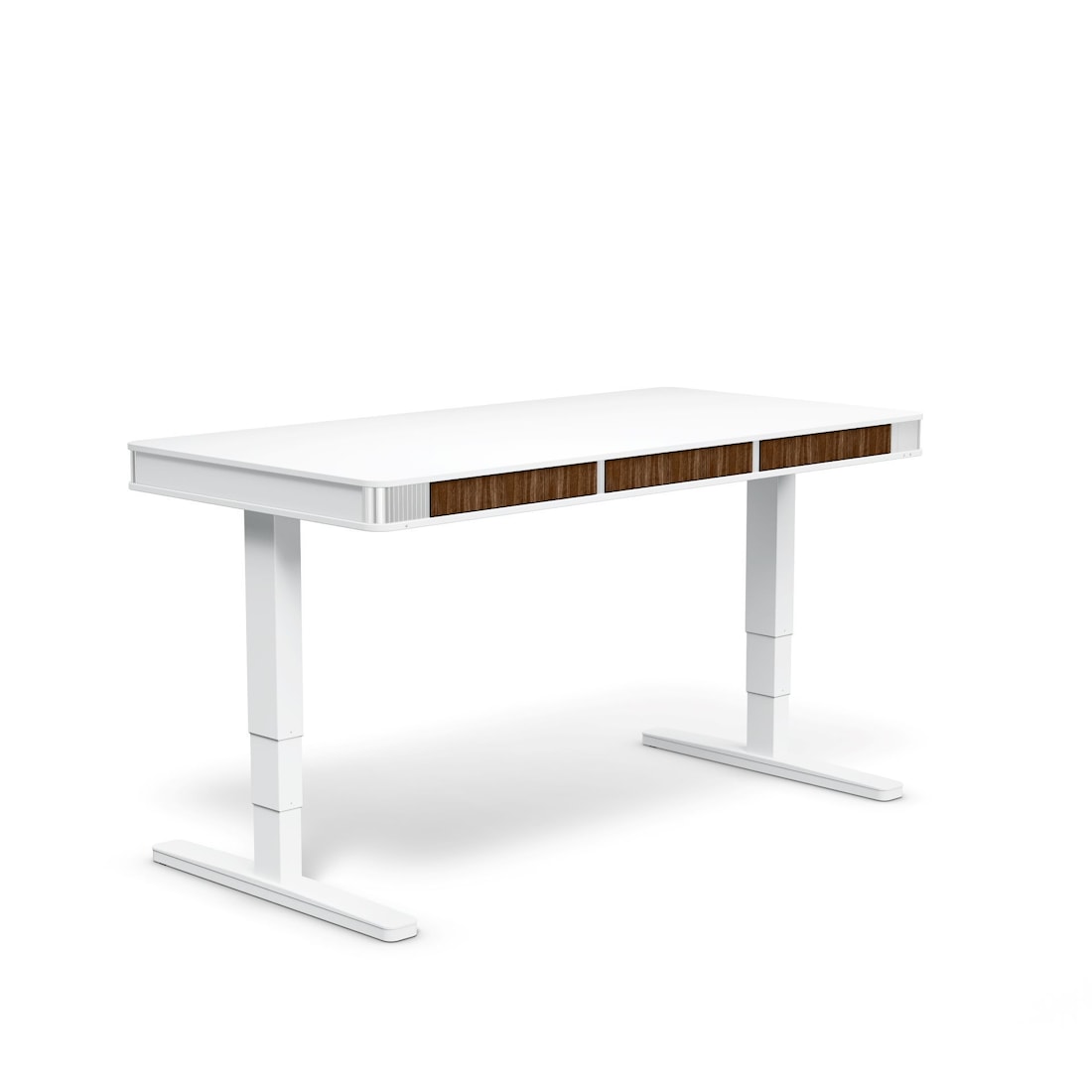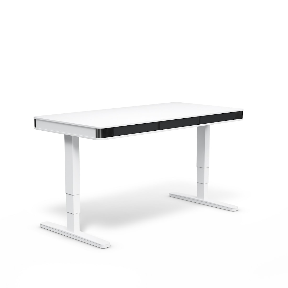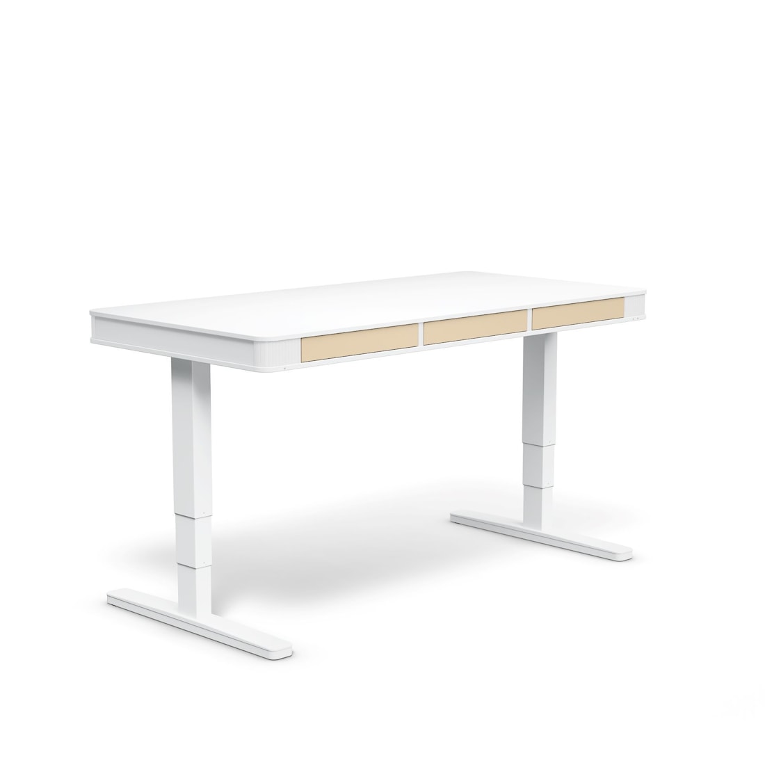 Дизайнерский регулируемый стол moll T6 L доступен в 2-х цветах корпуса, 5-ти цветах декора ящиков и 3-х отделок алюминиевого профиля: