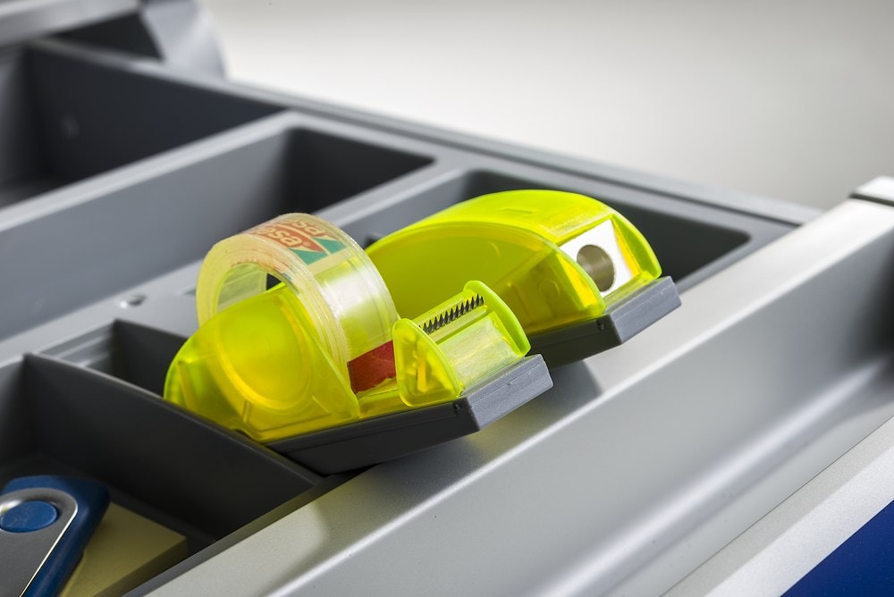 Ящик для растущей парты Winner или Wnner Slit разделен на 3 отделения разного размера. К каждому из них прилагается специальный вкладыш из плотного поролона, который препятствует скольжению мелких предметов внутри ящика.